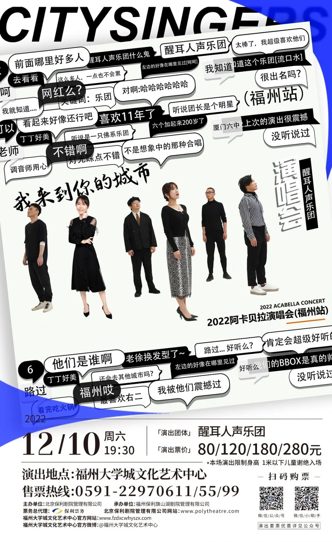2022.12.10【“醒耳人声阿卡贝拉演唱会”】 演出 10月26日 bernsine 取消关注 关注 私信 演出时间: 2022年12月10日(周六)19:30演出地点: 福州大学城文化艺术中心 演出团体: 醒耳人声乐团 演出票价: 80/120/180/280元 双人套票: 460元(原价280元*2张) 演出时长: 约90分钟 原文连接