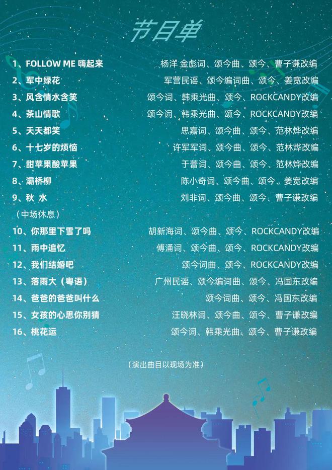 2023.9.10【阿卡贝拉的美妙夜——颂今经典老歌演唱会】 演出 8月08日 bernsine 取消关注 关注 私信 演出时间 2023年9月10日(星期日)20:00 演出场馆 广州市中山纪念堂 演出票价 580/380/280/180/80元 温馨提醒 1、儿童购票:儿童没有身高限制,儿童全票, 一人一票,谢绝怀抱婴儿入场。 2、请勿携带食品、饮料进场。 原文连接
