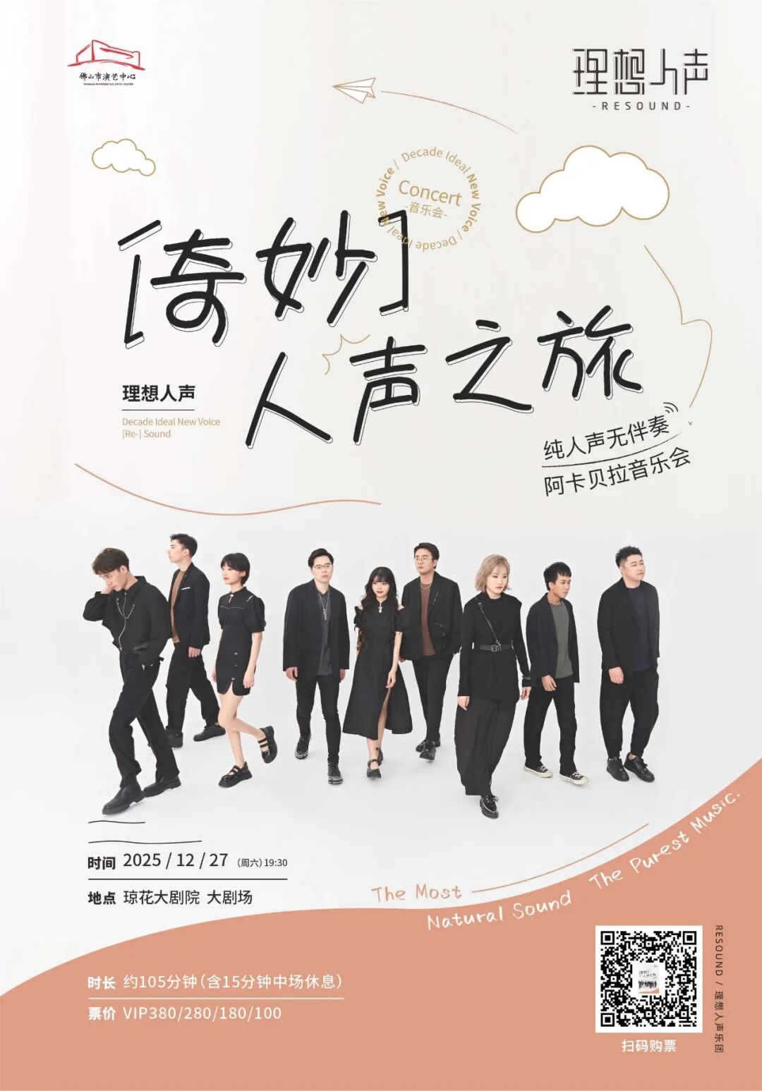 2025.12.27【奇妙人声之旅·理想人声阿卡贝拉音乐会】 演出 10月26日 bernsine 取消关注 关注 私信 演出时间 2025年12月27日(周六)19:30 演出地点 琼花大剧院 大剧场 演出时长 约105分钟(含15分钟中场休息) 演出票价 VIP380/280/180/100 演出曲目单 1.walk on2.饿狼传说 3.lose control 4.夜空中最亮的星 5.that girl 6.广府情 7.弯弯的月亮 8.动漫组曲 ——中场休息15min —— 1.电影组曲2.动画组曲 3.离开地球表面 4.找自己 5.bbox solo 6.望春风 7.九儿 8.陪你度过漫长岁月 原文连接