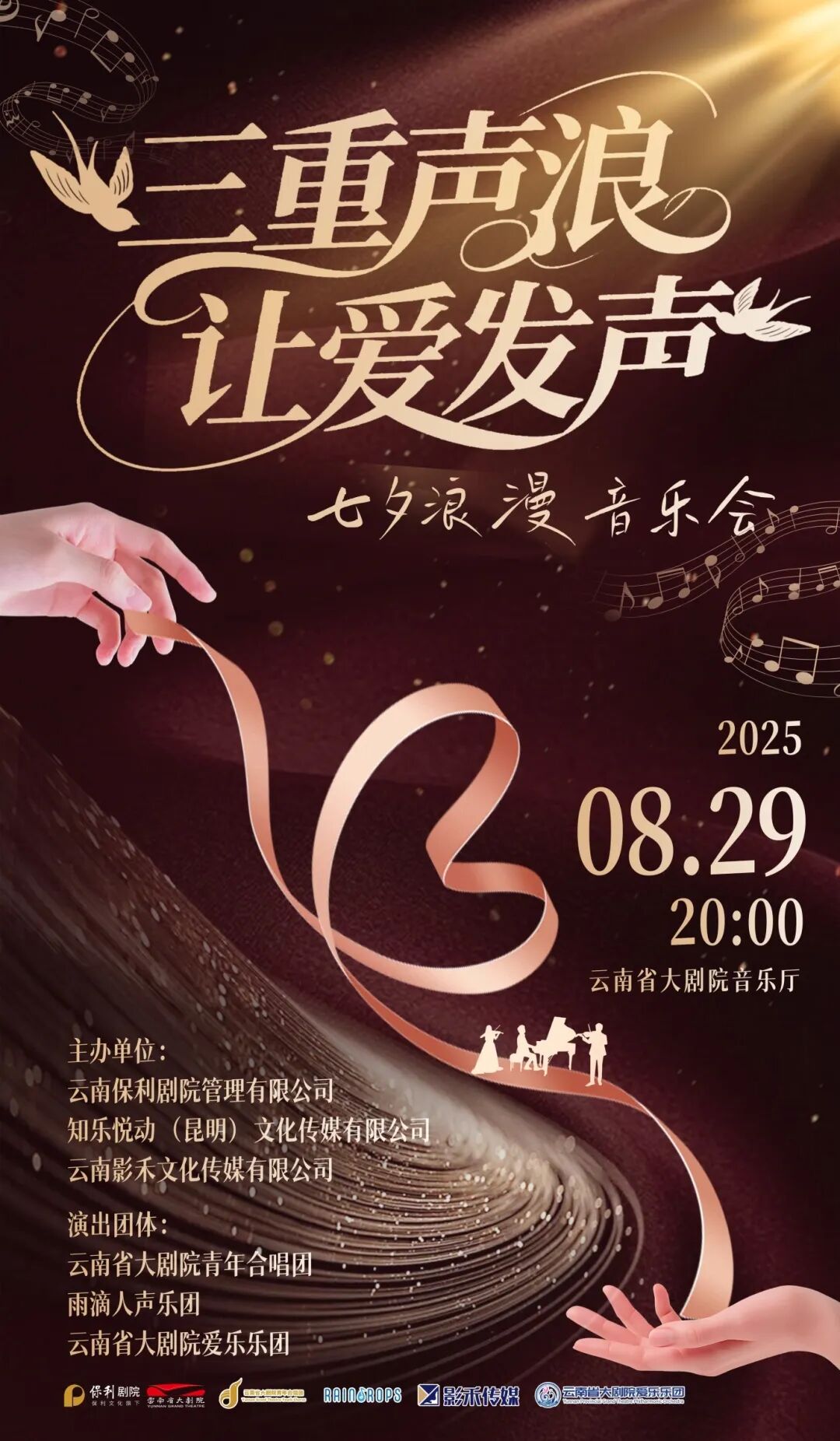 2025.8.29【“三重声浪·让爱发声”七夕浪漫音乐会】 演出🎤 8月20日 BERNSINE🎤主理人 取消关注 关注 私信 | 演出名称 | “三重声浪·让爱发声”七夕浪漫音乐会 | 演出时间 | 2025年8月29日 (周五)20:00 | 演出地点 | 云南省大剧院 音乐厅 | 演出时长 | 约100分钟 (不含中休) | 曲目单 | 《贝加尔湖畔》 词曲:李健 合唱改编:吴昊 《至少还有你》 (Feat.云南省大剧院青年合唱团) 词:佚名 曲:Davy Chan 《我要你的爱》 (Feat.云南省大剧院青年合唱团) 词曲:姚敏 原文连接