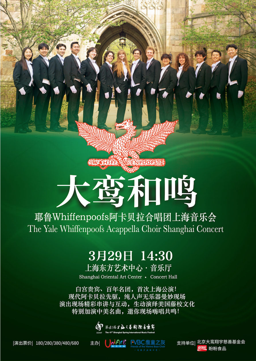 ✨2026.3.29【大鸾和鸣 · 耶鲁Whiffenpoofs阿卡贝拉合唱团上海音乐会】 演出🎤 3月16日 BERNSINE🎤主理人 取消关注 关注 私信 大鸾和鸣耶鲁Whiffenpoofs阿卡贝拉合唱团上海音乐会The Yale Whiffenpoofs Acappella ChoirShanghai Concert 演出时间2026年3月29日(周日)14:30地点上海东方艺术中心·音乐厅 票价 680/480/380/280/180元 原文连接